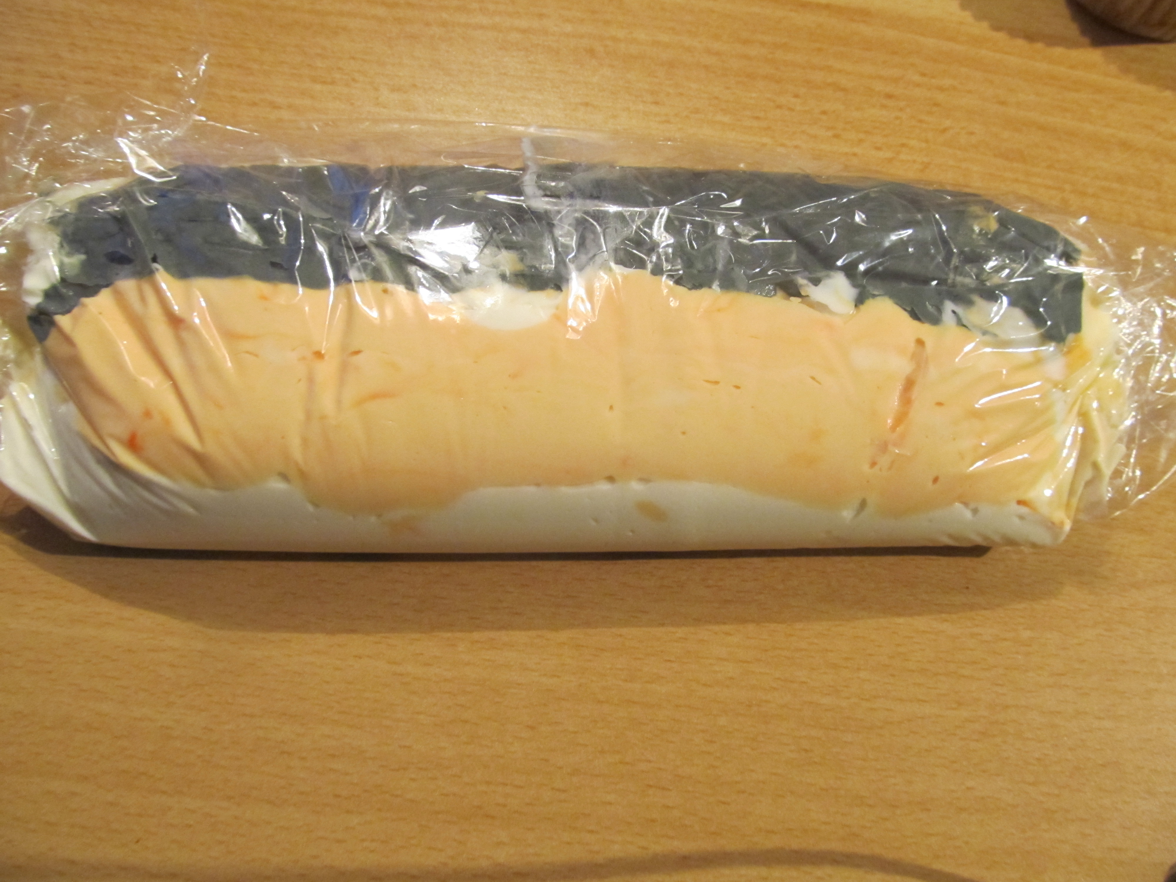 - Ein Stück Klarsichtfolie nehmen, die Farben drauf verteilen. Darauf achten das ihr rings herum Folie frei lasst, um es nachher zusammenrollen zu können.