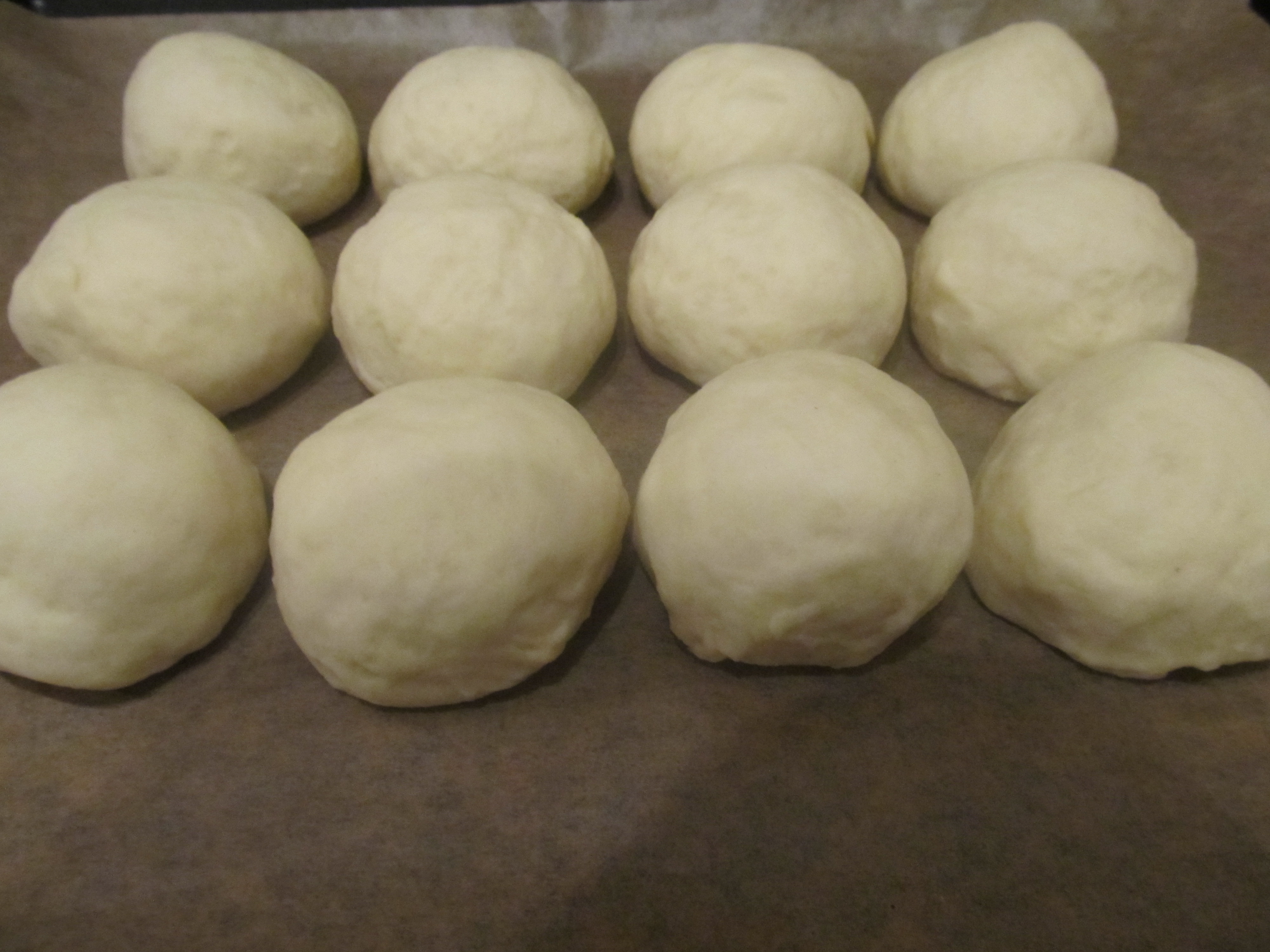 - Den gesamten Hefeteig abwiegen. Das waren bei mir 700g. Das Gewicht vom Hefeteig durch 12 Stück teilen. Bei mir kam 58,333333g raus. So habe ich alle Teiglinge mit 58g abgewogen. So sind alle Teiglinge gleich groß.