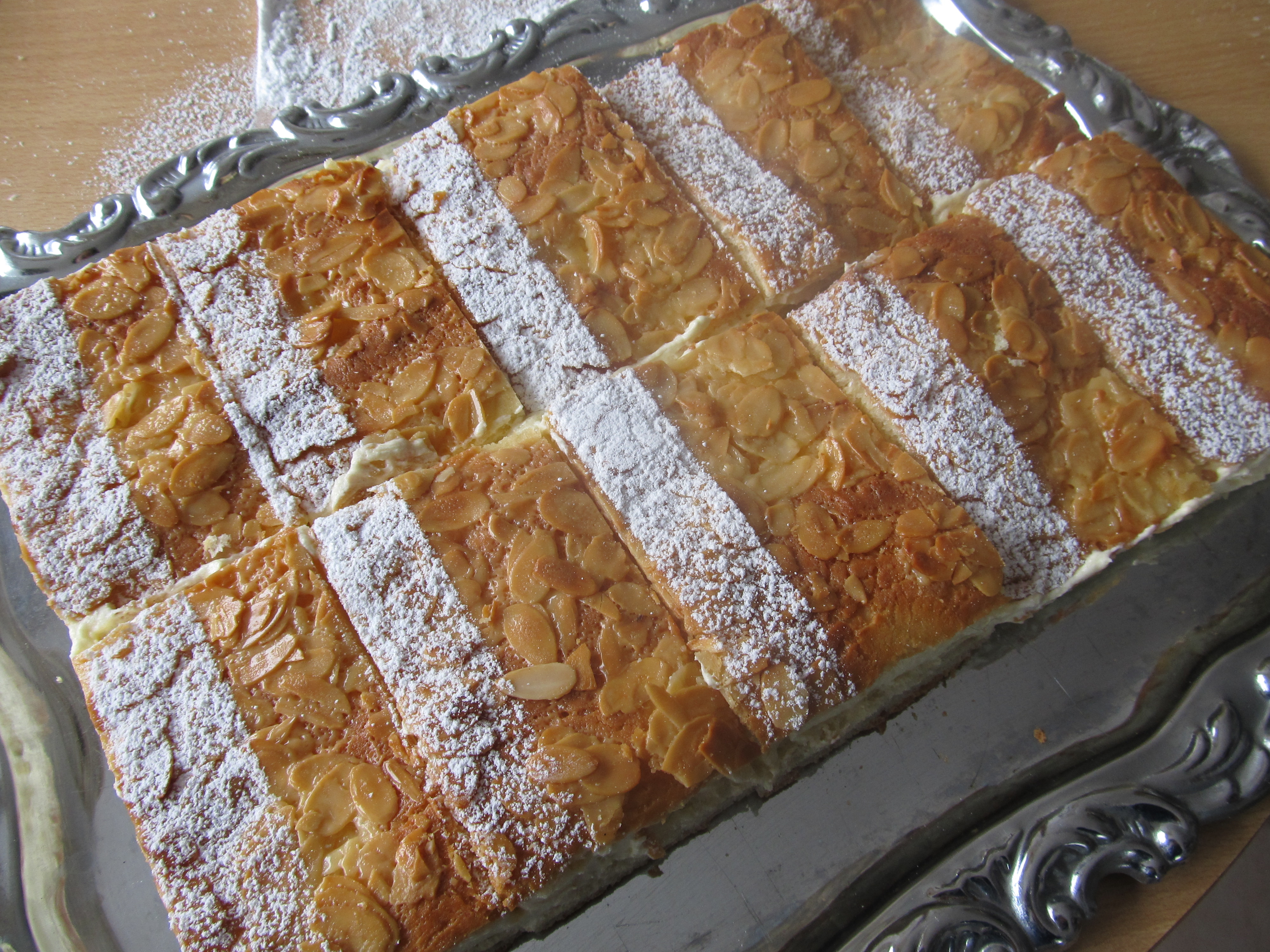 Ein Klassiker der deutschen Küche. Ein Hefeteig mit einer Butter… Zucker…Mandelmasse die beim Backen karamellisiert, gefüllt meist mit einer Vanillesahnecreme oder einer Vanillebuttercreme.