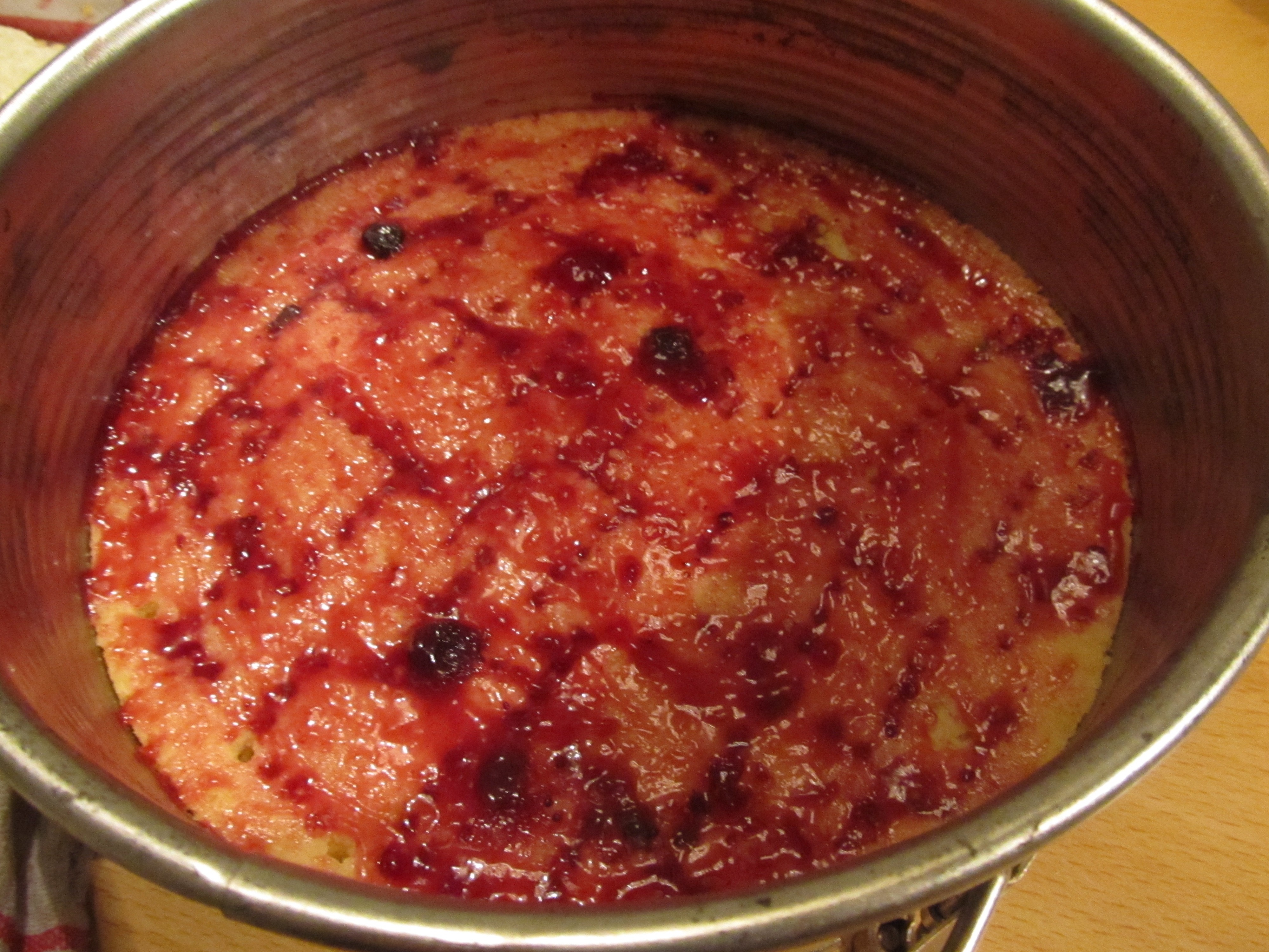 - Auf den Mürbteig Marmelade nach Wahl draufstreichen… ich habe eine Waldbeermarmelade genommen. (Sie dient als Kleber zwischen den Böden.)
