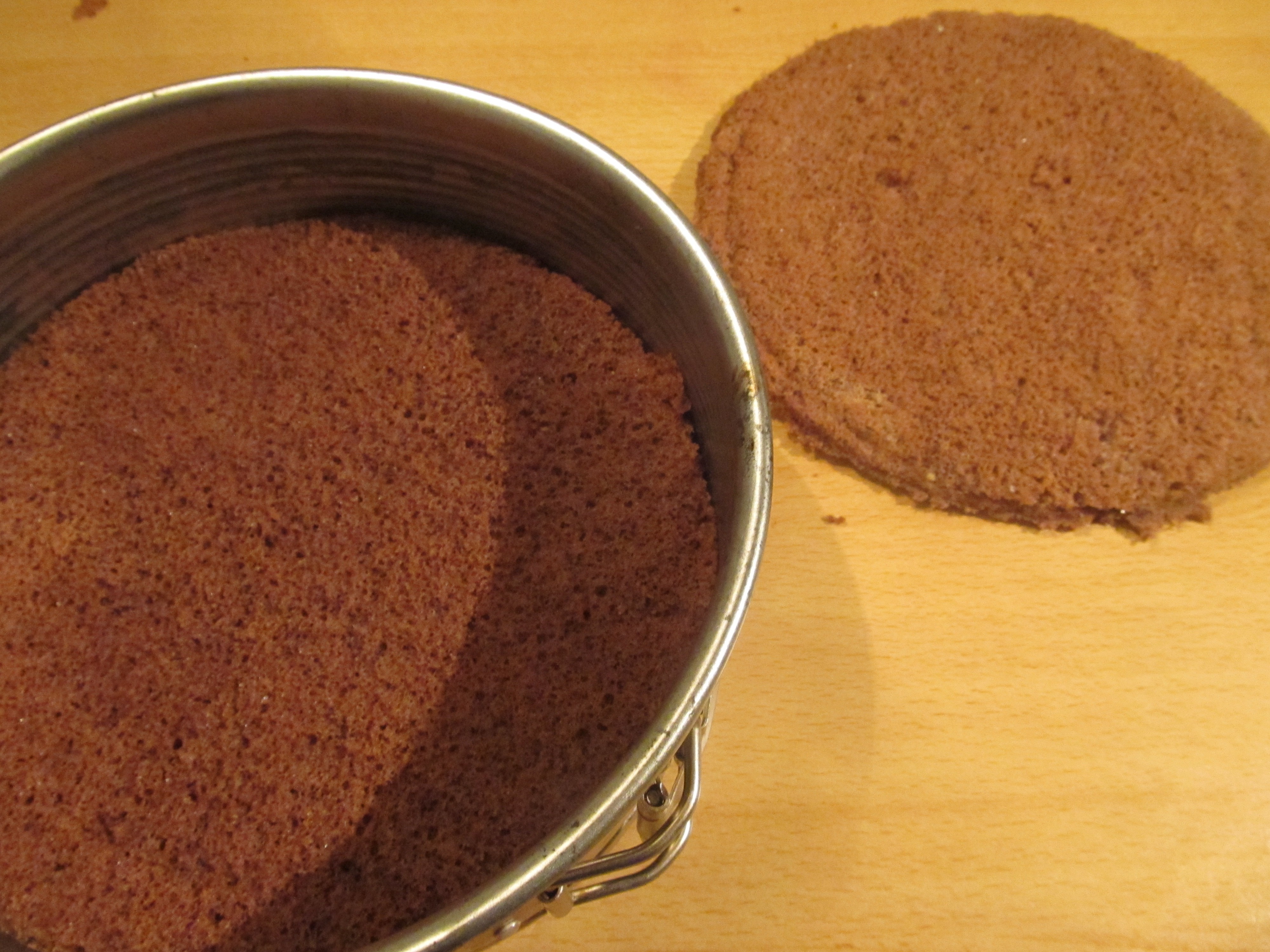 - Aus der Schokoroulade zwei Kreise ausstechen und einen davon auf die Marmelade legen.