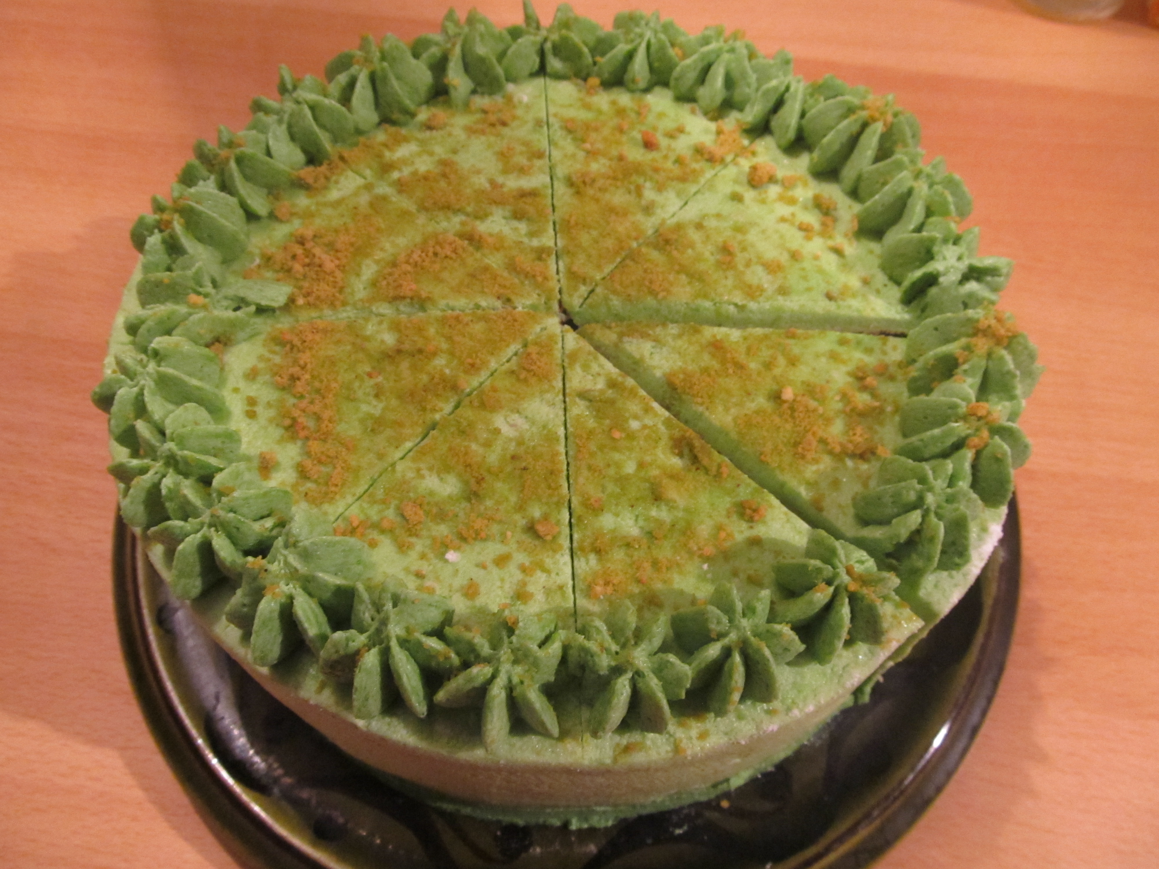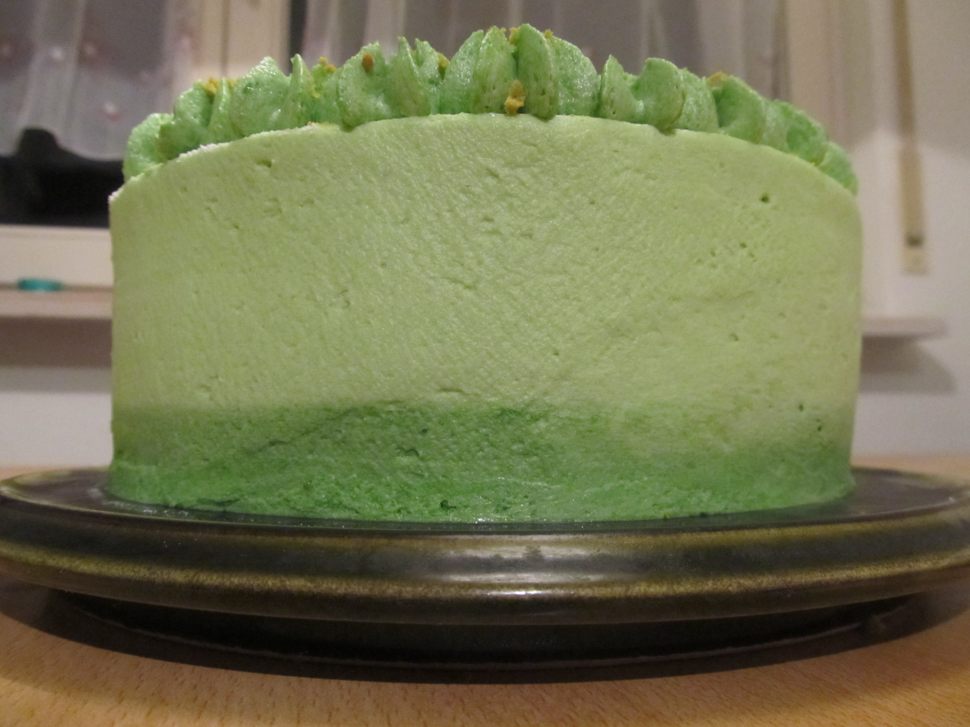 - Mit der dunkleren grün und einem Spritzbeutel mit Sterntülle die Torte verzieren und in die Mitte gemahlene Pistazien streuen.