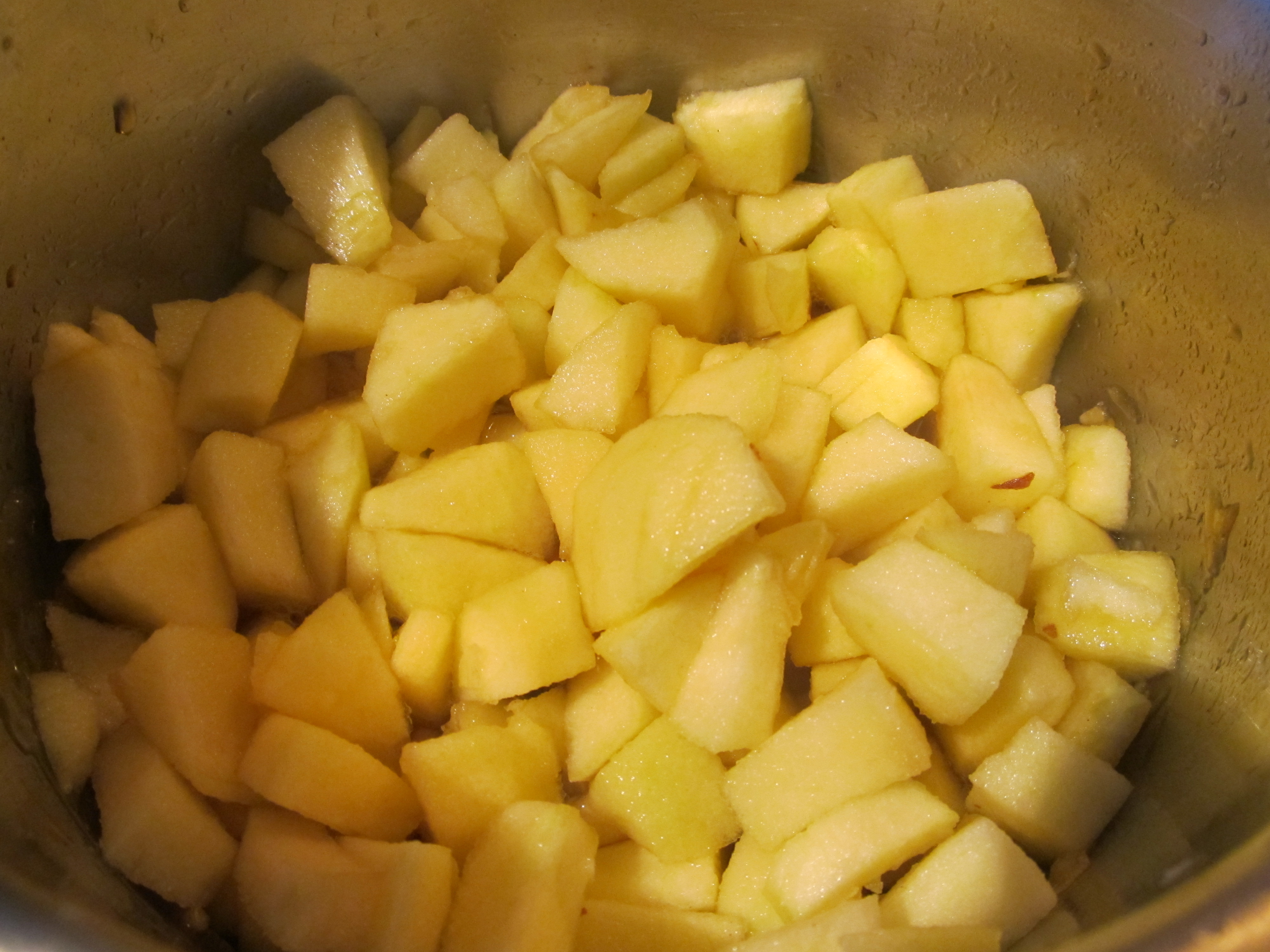 - Äpfel schälen, entkernen und in kleine Würfel schneiden.