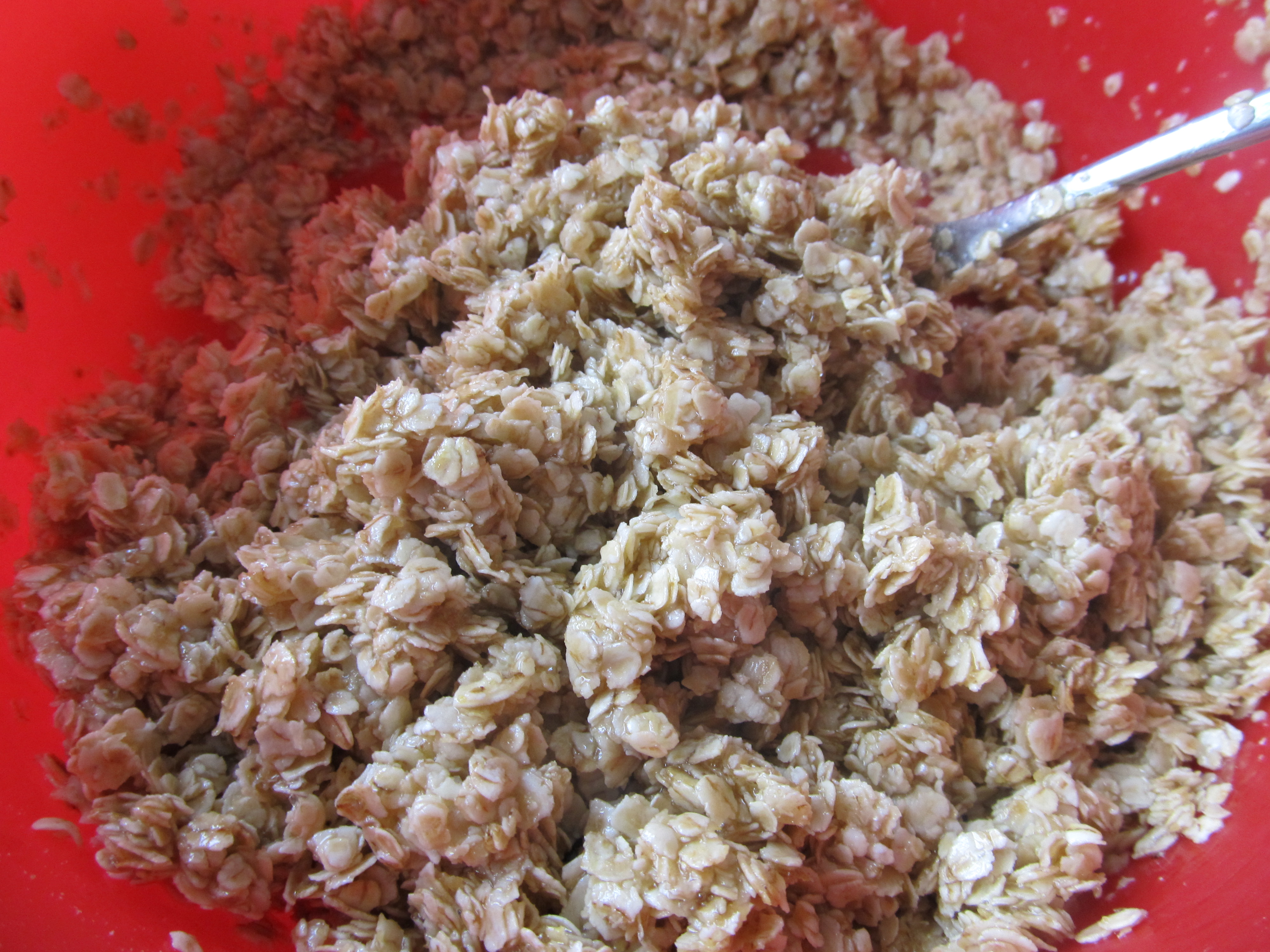 - Die Butter-Honigmasse in die Schüssel mit den Haferflocken und dem Zucker geben und durchrühren… so das eine gleichmäßige Masse entsteht.
