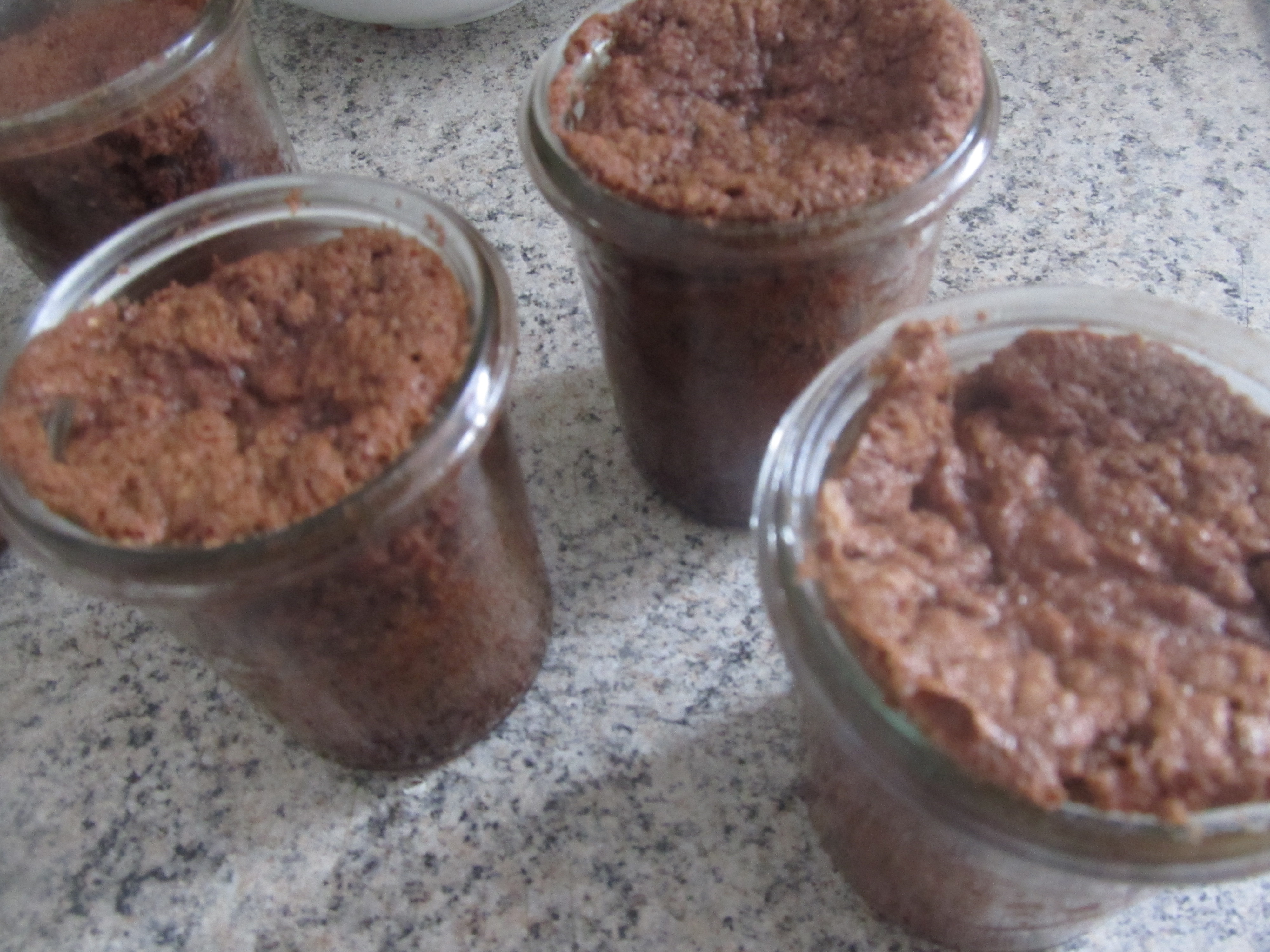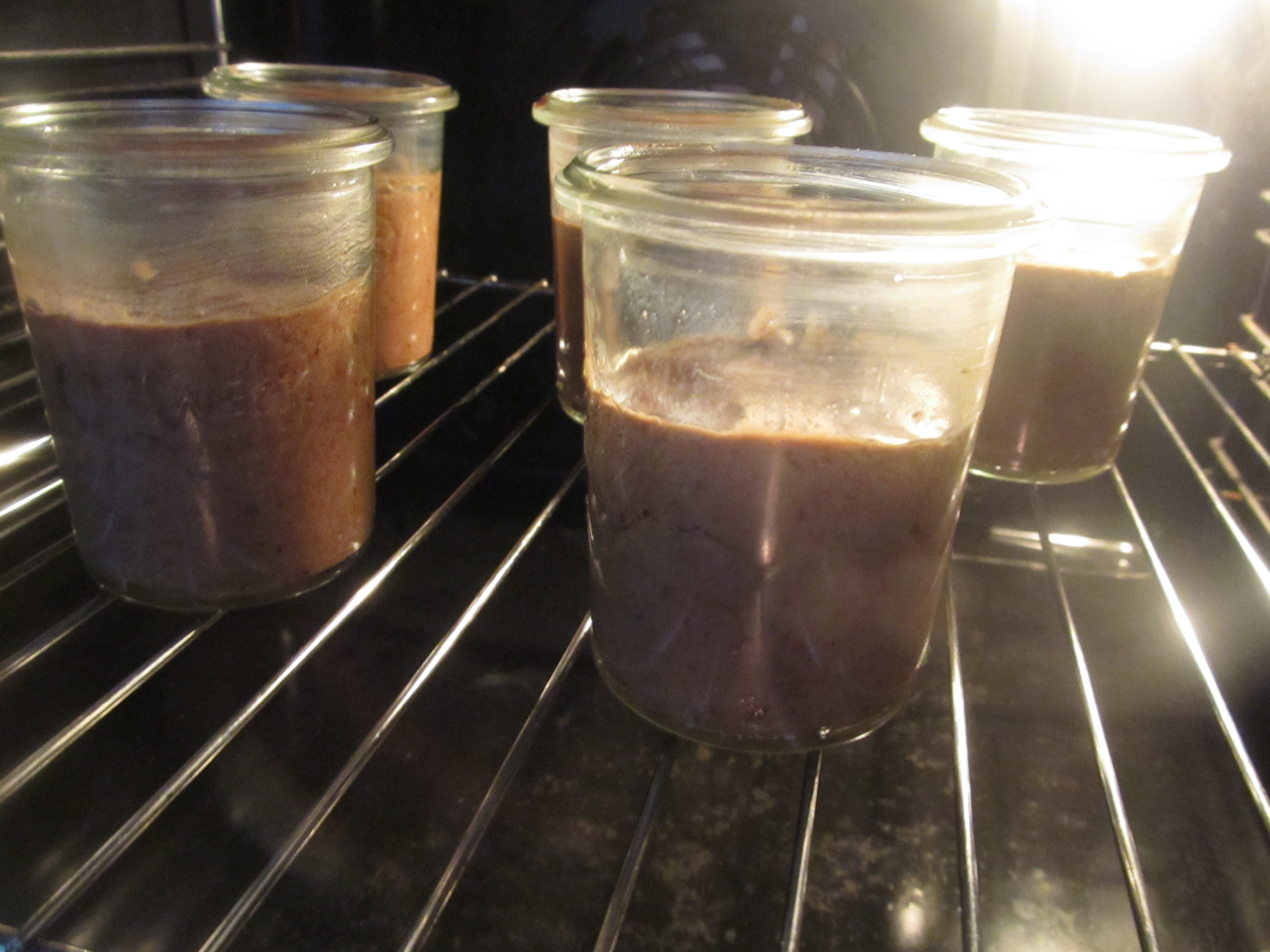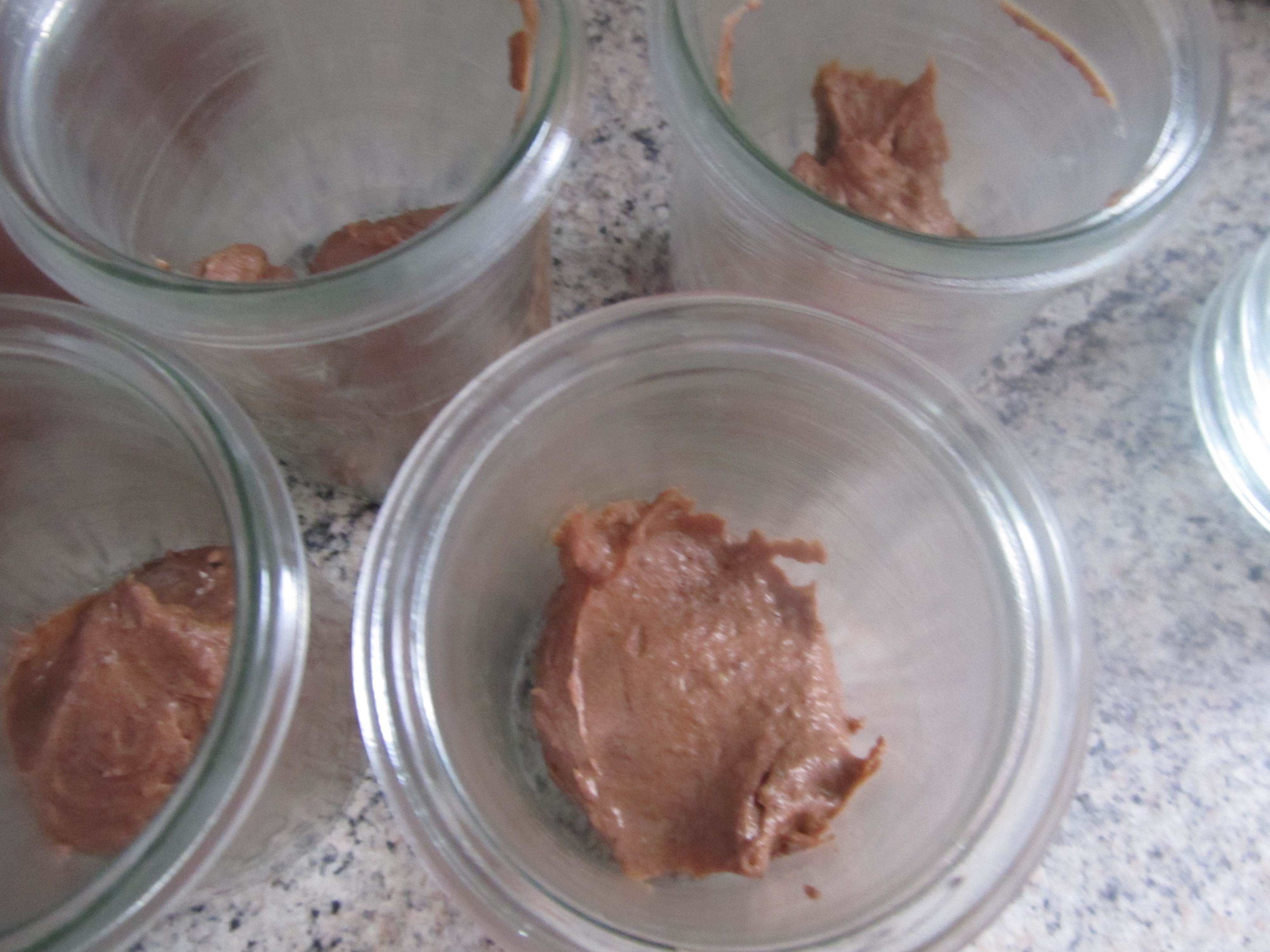 - Ein Riebchen Karamelschokolade in die Mitte des Teiges drücken und das Glas bis zu 3/4 voll mit Teig füllen.