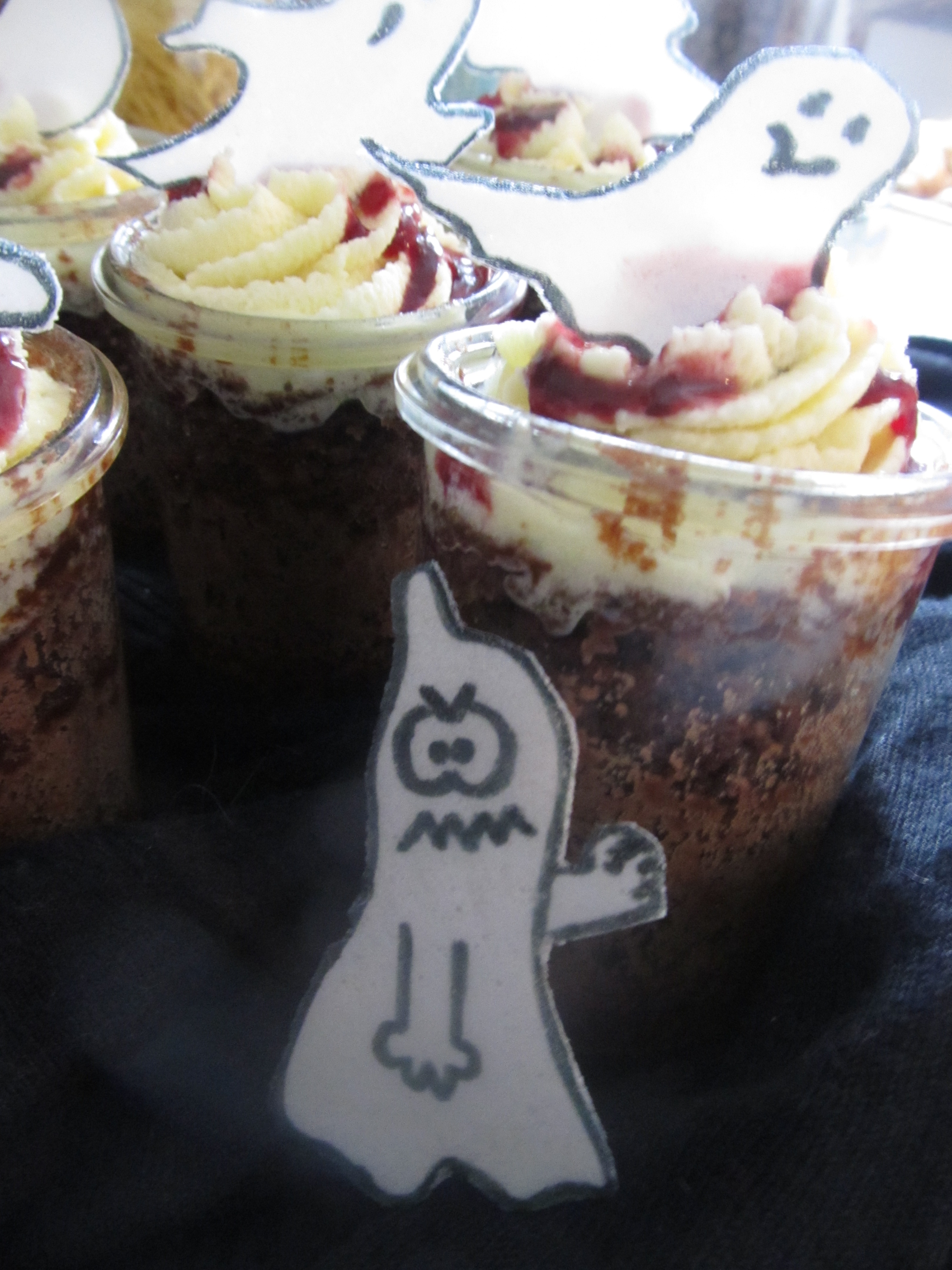 - Jetzt könnt ihr als Halloween Deko zum Beispiel die gruseligen Oblaten Geister aus meinem letzten Beitrag (klick hier) oben etwas in die Ganache reinstecken.