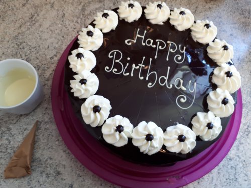 - Das „Happy Birthday“ habe ich mit weißer Schokolade in einem Spritztütchen gespritzt.