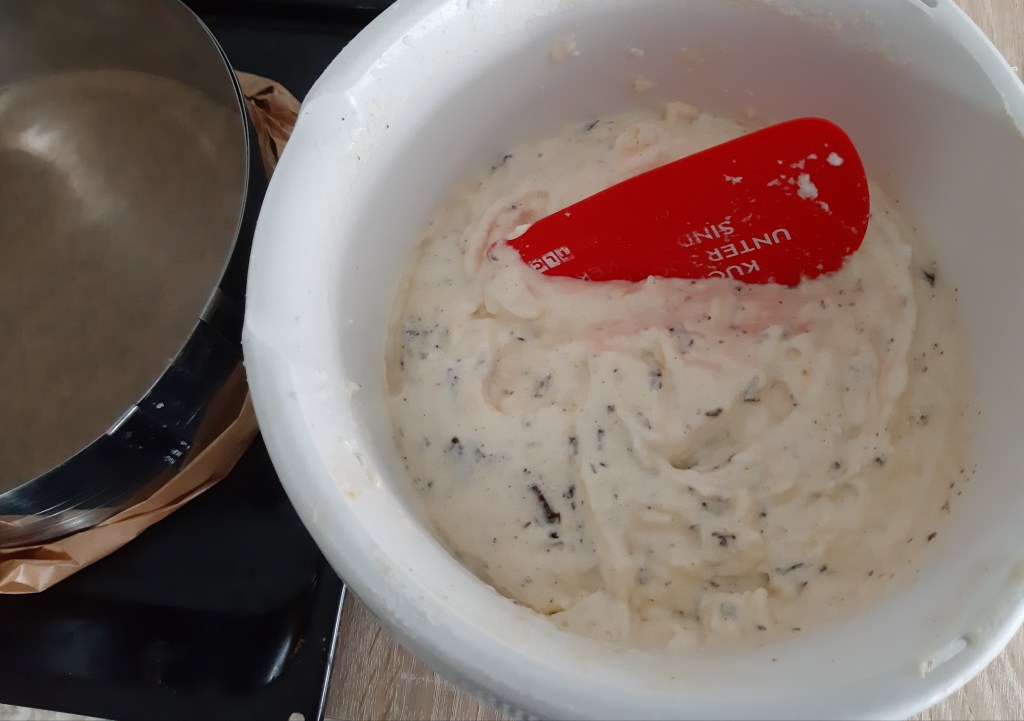 - Zum Schluss vorsichtig die gehackte Zartbitterkuvertüre unterheben.