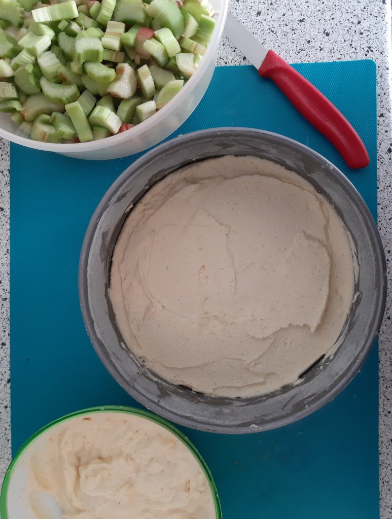 - Nun die Rhabarberstückchen drauf verteilen.