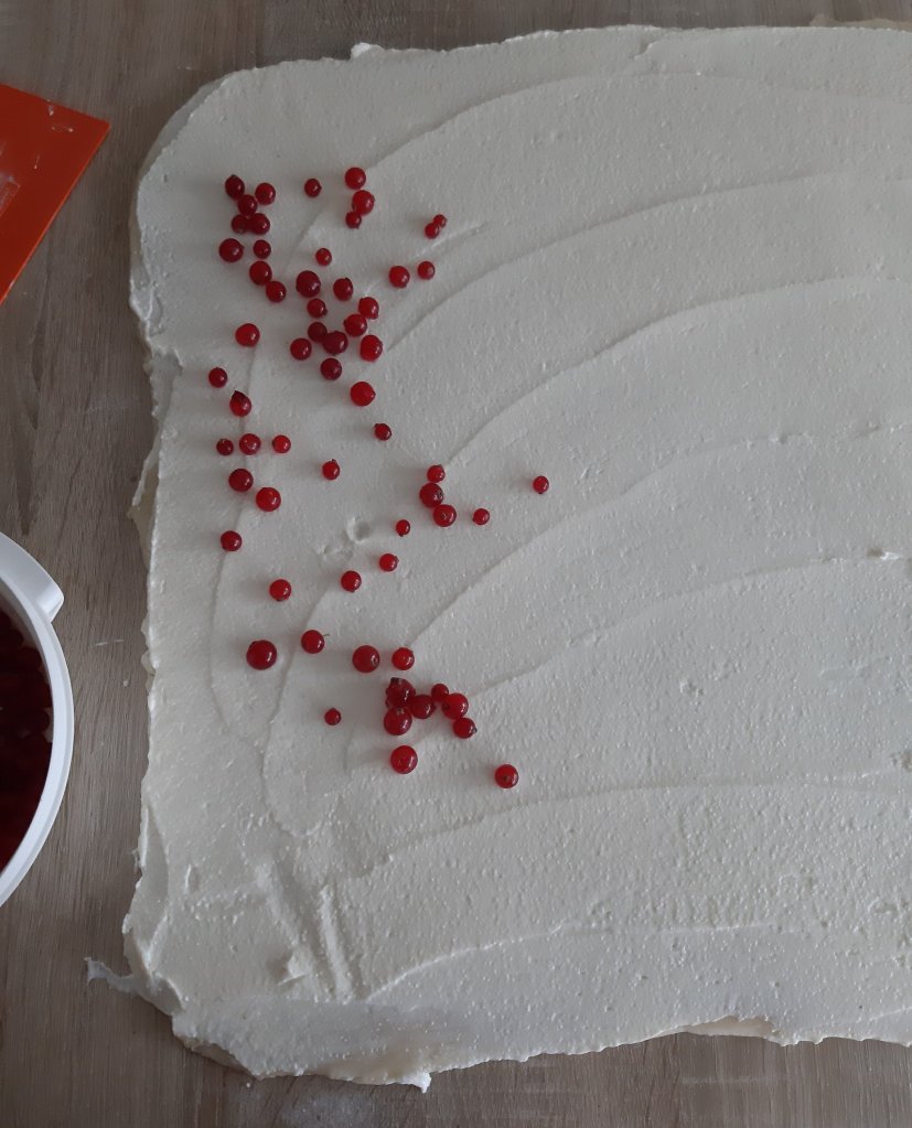 - Mit der Füllung bestreichen und die Johannisbeeren darauf verteilen.