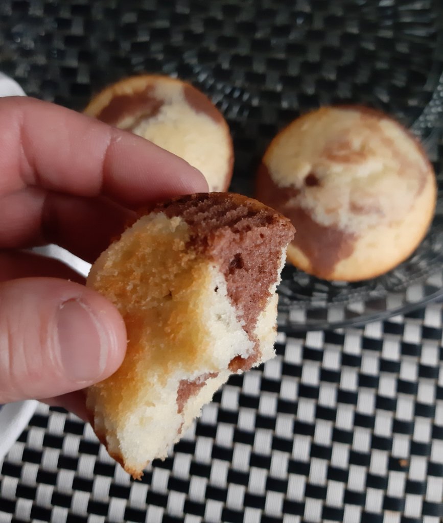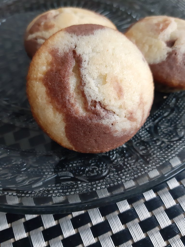 - Zum Schluss kann man sie mit Puderzucker bestäuben oder mit Schokoladen- oder Zuckerglasur überziehen. Ich habe meine Mini Marmor Muffins so gelassen, weil ich die Marmorierung so schön fand. Wenn ich sie mit Schokolade überzogen hätte, hätte man diese nicht mehr gesehen.