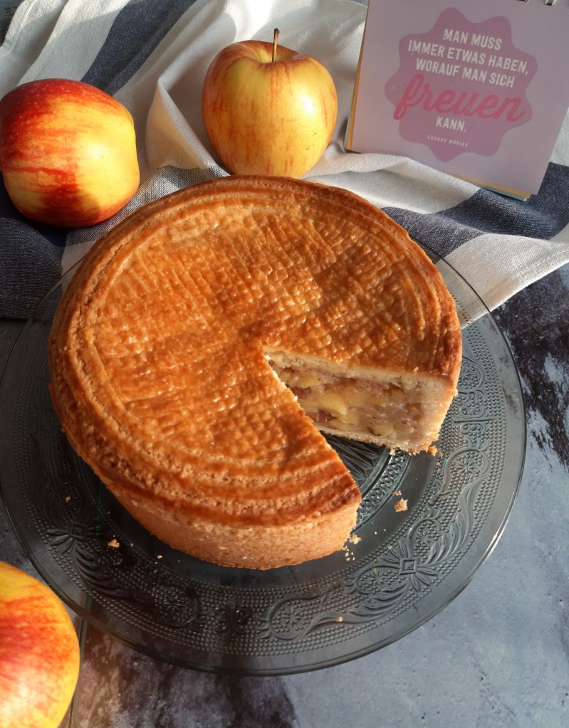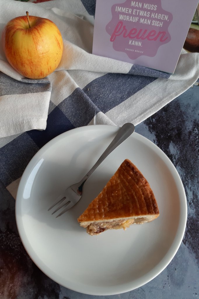 Einen mit einer herrlich leckeren Apfelfüllung die ummantelt ist mit Mürbteig… einen gedeckten Apfelkuchen. Ja… den wollte ich schon lange mal backen. Natürlich habe ich nicht alle Äpfel verarbeiten können, weil es so viele waren. Aber kein Problem… ich wollte ja dieses Jahr sowieso anfangen mich gesünder zu ernähren. Daher gab es seit Anfang des Jahres jeden Morgen einen Apfel zum Frühstück. Eigentlich esse ich kaum Obst… daher ist das ein enormer Fortschritt für mich 🙂 Bei Kuchen sieht das anders aus. Ich esse am liebsten Kuchen mit Obst… wie Erdbeerkuchen, Himbeerkuchen, Zwetschgendatschi oder auch Apfelkuchen… nur um mal ein paar zu nennen.