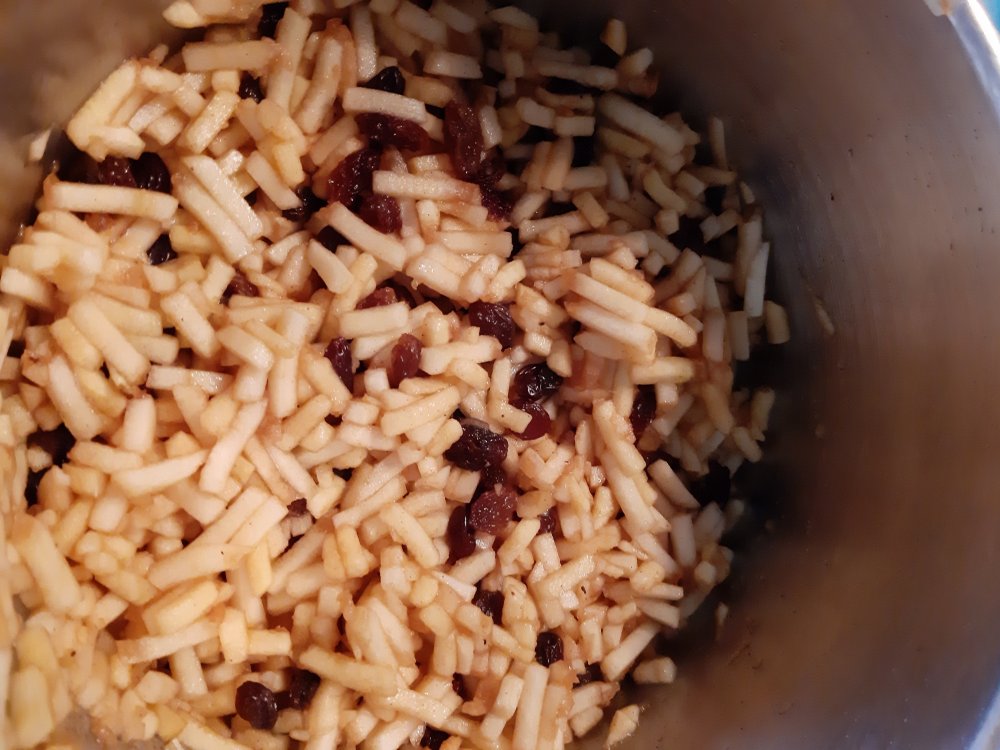 - Dann den Zucker, Rosinen, Rum und Zimt zu den Äpfeln geben und gut vermischen.