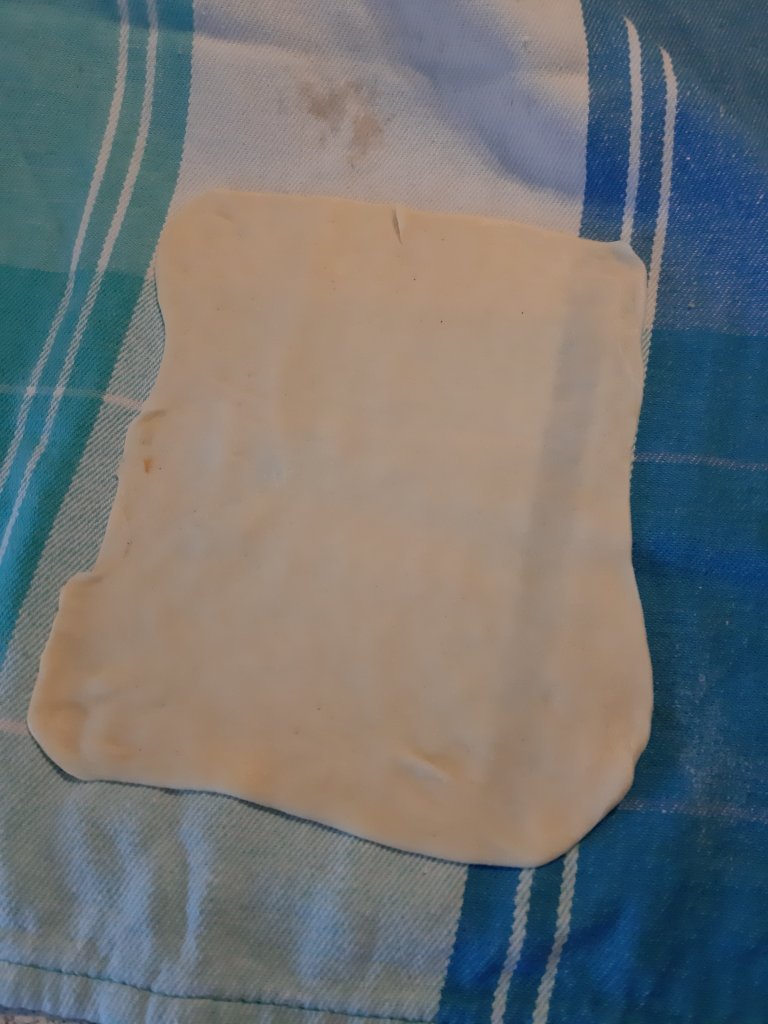- Den Teig dünn ausrollen und dann von Hand auseinanderziehen, so dass der Teig sehr dünn wird und man das Geschirrtuch durchscheinen sieht.