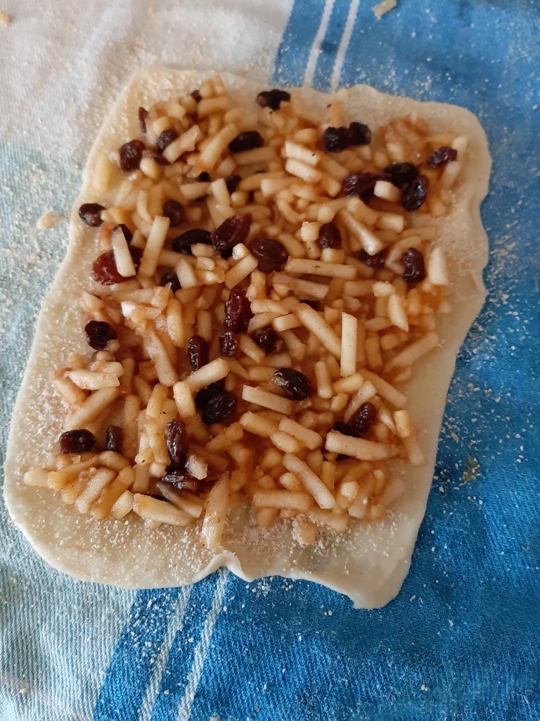- Eine Schicht von der Apfelfüllung drauf verteilen. An den Rändern etwas Abstand lassen.