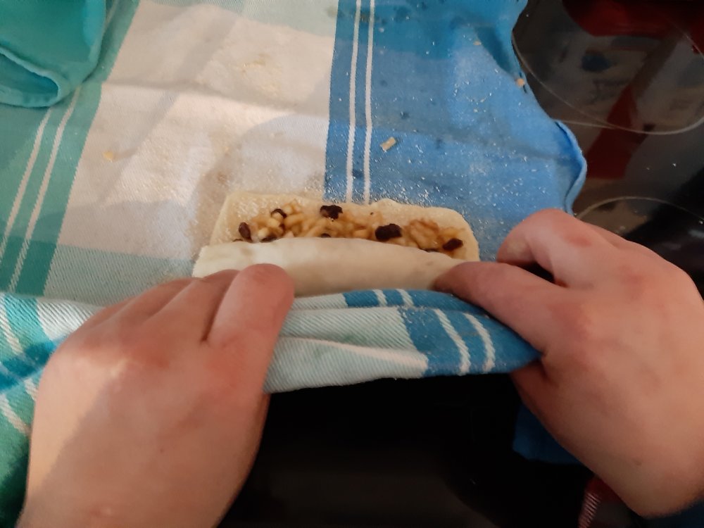 - Nun mit Hilfe des Geschirrtuchs den kleinen Strudel zusammenrollen.