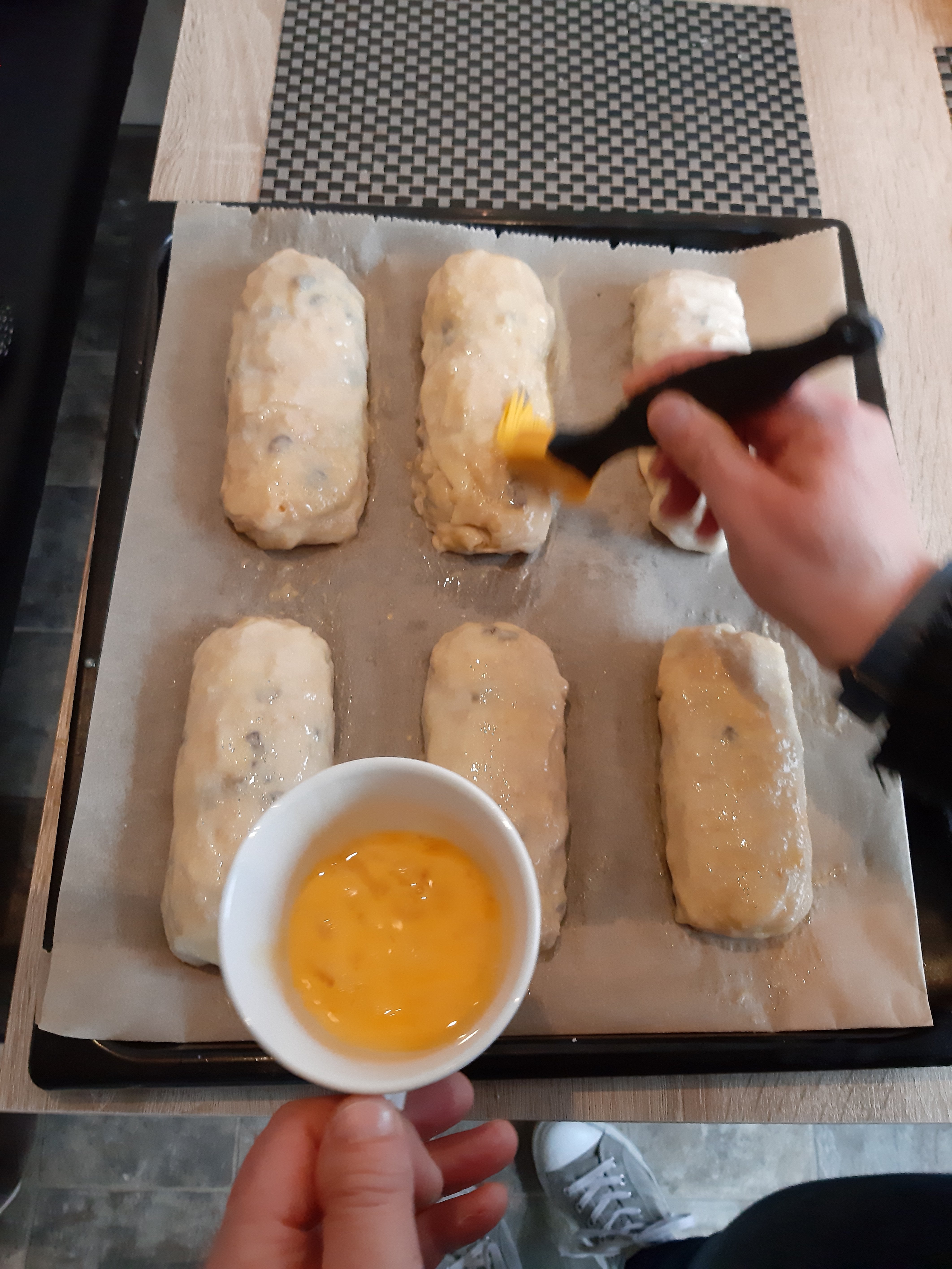 - Die Strudelchen auf ein Backblech mit Backpapier legen und mit dem verquirltem Ei bestreichen.