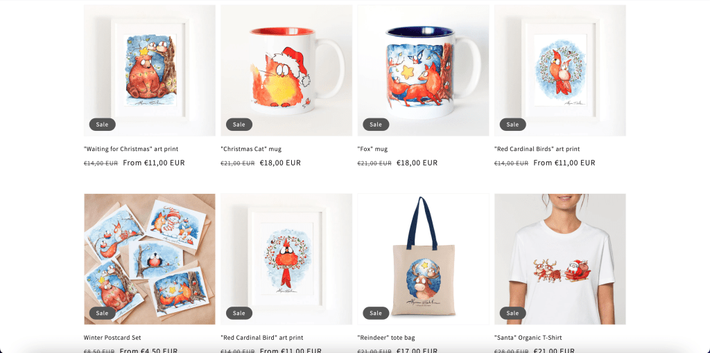 Richtig süsse Geschenkideen findet ihr bei Alyona Shilina Illustration store. Alyona zeichnet alle ihre Motive selbst. Ob Bilder, Tassen, T-Shirt, Postkarten oder Taschen... hier findest du bestimmt die Liebe deines Lebens. Ihre Zeichnungen sind so hinreissend und zum dahinschmelzen. Einen Hacken gibt es allerdings. Alyona Shilina wohnt in Spanien, daher ist der Versand für große Pakete mit 11€ nicht gerade günstig. Aber man wird entschädigt mit so schönen Motiven, guter Qualität und zu meinem Paket hat sie mir ein paar Weihnachtspostkarten und Liebe Worte gratis mitgeschickt.