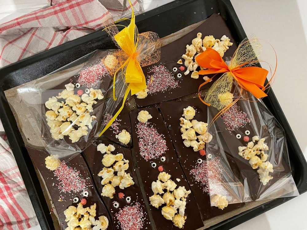 - Sobald die Schokolade etwas fest geworden ist, sie in Stücke schneiden. Oder warten bis sie fest geworden ist und brecht sie dann in Stücke.